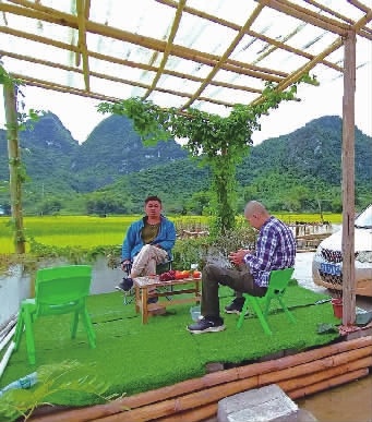 10月17日下午,两人到达广西崇左市大新县境内,青翠的甘蔗林、金黄色的稻田、丹霞地貌山丘,瞬间吸引了他们,于是决定在这幅“画”中安营扎寨。