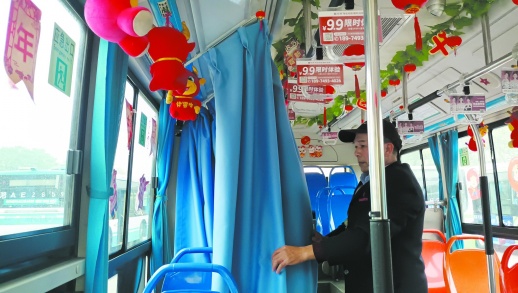 弧形轨道、蓝色窗帘布,简简单单的一改造,公交车上便隔出了一方小小天地。拉上帘布是临时的妈妈哺乳房,拉开又是普通座椅。这个巧妙的小心思,来自公交车司机刘德凡。
