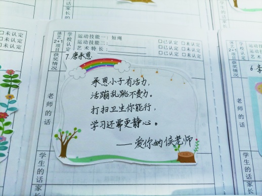 “承恩小子有活力,活蹦乱跳不费力。打扫卫生你能行,学习还需更静心。”长沙市天心区丰城小学的老师侯瑛,为了给孩子最特别的期末评语,为班上18个孩子独创了专属他们的儿歌和手制成长树,孩子们直呼“好幸福”。