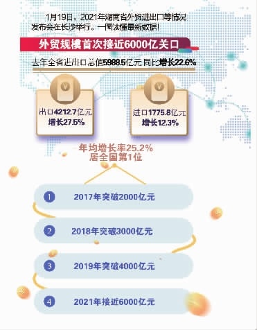 1月19日,省政府新闻办在长沙举行2021年湖南省外贸进出口等情况发布会。记者从会上了解到,2021年,湖南进出口总值5988.5亿元,比上年同比增长22.6%。年均增长率达25.2%,居全国第一位。另据长沙海关统计,2001年湖南进出口总值仅229.4亿元,20年增长超过25倍。