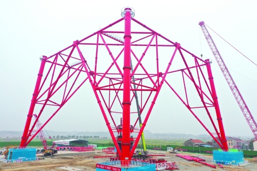 2月16日,临湘市江南镇,南阳-荆门-长沙特高压交流工程螺山长江大跨越工程,跨越塔首段40.5米组立完成。该工程共2基跨越塔,分别位于湖北洪湖与湖南临湘江南镇。湖南侧跨越塔率先施工。该塔高371米,是世界上最高、最重、跨越档距最大的特高压铁塔。