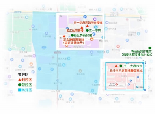 封控区:五一华府宾馆所在楼栋、名汇达商务楼、正宗浏阳蒸菜馆(青石井巷28号)、长沙市八医院核酸采样点 ,严格执行“区域封闭、足不出户、服务上门”管理措施,人员实行集中隔离或居家隔离医学观察。