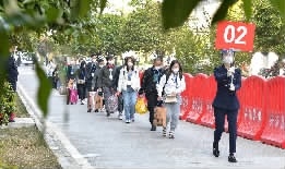 早上7点,娄底双峰县第一批转运的49名旅客排好队伍,工作人员为他们进行体温检测后,大家提着行李,迈着轻快的步伐,朝大巴车走去。