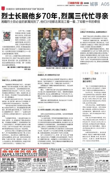 湘籍烈士田必金的家属找到了,他们计划都去黑龙江看一看,了却数十年的牵挂