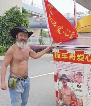 严家满小板车的后面,贴着自己徒步募捐出发时的新闻报道,图片中的他牛仔帽、络腮胡,皮肤黝黑,身形健美,八块腹肌引人注目。眼前的中年男子,除了牛仔帽和黝黑的皮肤,多年餐风露宿的奔波,让他身形不再挺拔,背微驼,须发灰白,腹肌也没有了,当年意气风发的“板车哥”真真切切地老了。