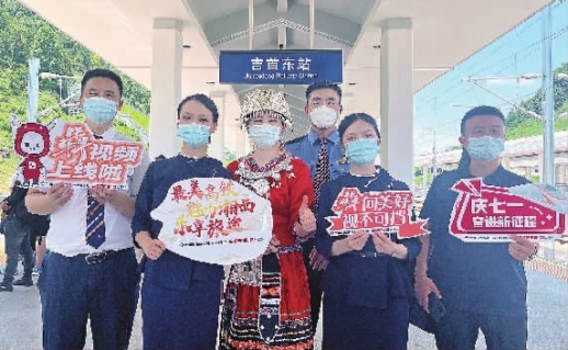 “和我在古城的街头走一走,直到所有的灯都熄灭了也不停留,走到那边城的尽头,坐在芙蓉镇的门口……”未见实景,已闻歌声。“美好号”列车上,广铁集团张吉怀高铁乘务组将《成都》改编成《高铁湘西》,用轻柔的旋律,唱尽湘西的质朴与悠然。