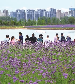 7月3日,长沙月亮岛景区紫兮庄园,成片的薰衣草、马鞭草等绚丽盛放,宛若一片紫色的海洋,吸引着众多游客前来欣赏拍照。
