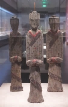 展览中三遵彩绘立俑引人注目。三遵彩绘立俑1972年出土于马王堆1号墓,现收藏于湖南省博物馆。该墓出土的彩绘木俑最多,共173件。一号墓以女俑为主,三号墓以男俑为主。这类木俑造型一致,形体较小,头插竹签愁眉苦脸,应是死者生前的杂役奴婢,地位最为低下。
