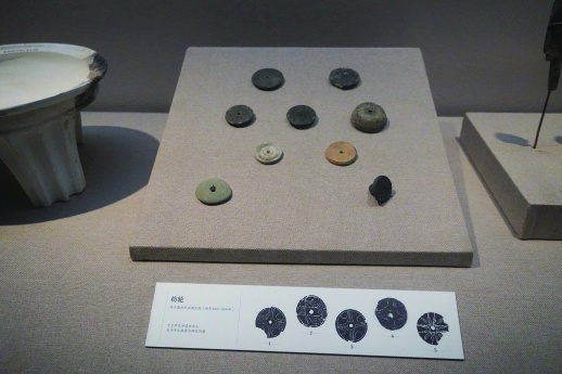 何佳指着展品中一组石纺轮介绍,“这是一组非常有特色的文物。这是手工纺纱用的,中间的孔穿上木棍,穿上丝、麻,下面吊一个纺轮,一转就可以纺纱了。”这组石纺轮每个下面都刻有花纹,考古人员查遍了周边的遗址,也没有找到相似的纺轮,反而在珠江流域的一个遗址中找到了相似的纺轮。何佳说:“这证明当时长沙与珠江流域是有文化交流的。”
