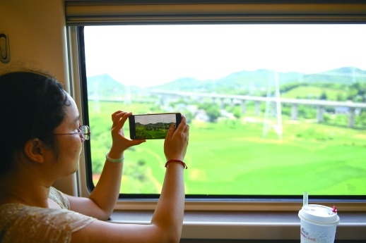 7月21日,一位试乘人员在列车上拍摄窗外的风景。当天,常益长高铁益长段试运行列车向媒体开放,从长沙抵达益阳全程耗时仅48分钟。列车餐车车厢有香辣小龙虾、腊味合蒸饭、猪肋骨拼香辣牛肉泡菜饭等湘式美食,这是一场地道的“湘”味之旅。图 湖南日报全媒体记者 辜鹏博 摄 视频 三湘都市报全媒体记者 和婷婷 周可