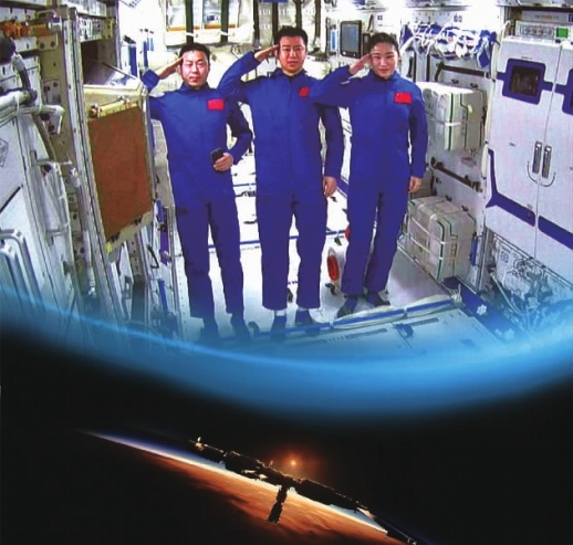 7月25日在北京航天飞行控制中心拍摄的神舟十四号航天员乘组进入问天实验舱。航天员陈冬(中)、刘洋(右)、蔡旭哲进入问天实验舱。 这是中国航天员首次在轨进入科学实验舱。