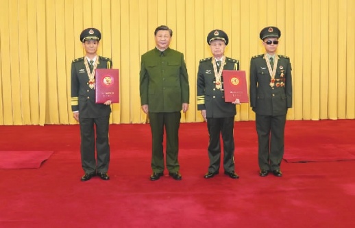 7月27日,中央军委颁授“八一勋章”和荣誉称号仪式在北京八一大楼隆重举行。中共中央总书记、国家主席、中央军委主席习近平向“八一勋章”获得者颁授勋章和证书,向获得荣誉称号的单位颁授荣誉奖旗。这是习近平同获得“八一勋章”的杜富国、钱七虎、聂海胜同志集体合影。 新华社 图