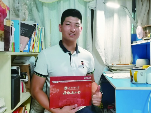 下午4时许,湖南科技大学党委书记唐亚阳来到彭兰溪家中送录取通知书。彭兰溪听到母亲的呼唤声,立即从沙发上“跳”下来,三两下赶到门口迎接。接过通知书,彭兰溪和家人一起打开,“这是我收到最棒的成年礼,我会在湖南科大继续努力,向着自己的梦想不断前进。”