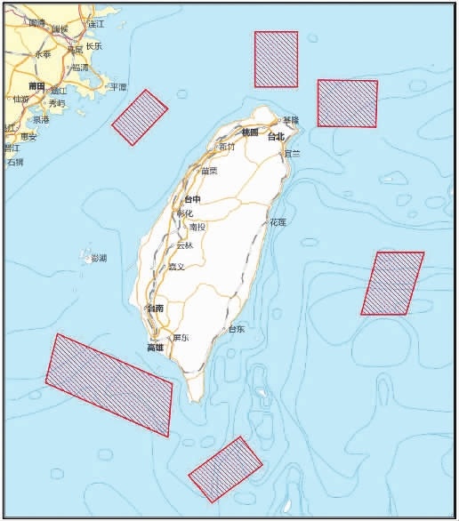 北纬22°56′00″、东经122°40′00″,北纬23°38′00″、东经122°51′00″,北纬23°38′00″、东经123°23′00″,北纬22°56′00″、东经123°09′00″四点连线。