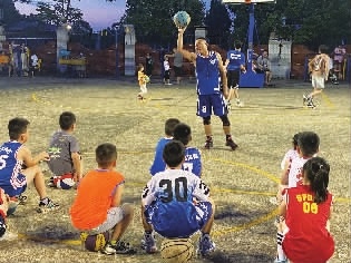 每年7月,湘潭市岳塘区荷塘街道清水村的傍晚总会响起有节奏的运球声,伴随着孩童的嬉笑、观众的欢呼……清水村的文化广场,两盏室外照明灯明晃晃地散着白光,粗糙的水泥地上黄色线条简单勾出篮球场的模样。