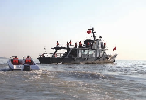 船艇驶离码头后,黎鹏顿打开舱门快速爬上甲板。下午4时,依旧火辣辣的太阳斜照在甲板上,然而甲板上35℃的高温与机舱内相比却显得凉爽。黎鹏顿坐在船舱的舱门上,抓过一瓶早已准备好的矿泉水,大口大口地灌了下去,帽檐下的汗珠也一滴一滴地滑到脖子上,身上的汗隔着两层衣服,将救生衣紧紧吸在外套上。