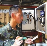 机电舱是船艇的“心脏”,为全船提供着动力、电力。不足10平方米的机电舱内,油、电、水、气线路纵横交错,分布着大大小小数千个零部件、上百个开关。掌管这里的战士,被称为机电兵。