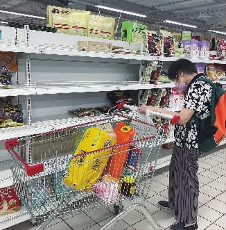 “这么大个商场,这么热的天竟然不开空调,真热。”家住侯家塘的赵先生,趁着买菜的空档来超市采购一些露营所需的小零食,未曾想超市中能买的东西却不多,最终只买了一袋大米后悻悻而归,“你看这桶花生油,上面攒了一层灰。”