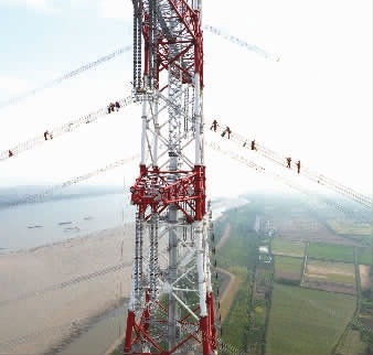 9月18日,在位于岳阳市临湘市的南荆长特高压工程螺山长江大跨越施工现场,国网山东送变电工程有限公司的工作人员在安装阻尼线(无人机照片)。近日,1000千伏南阳—荆门—长沙特高压交流线路施工进入最后冲刺阶段,计划10月中旬投运。