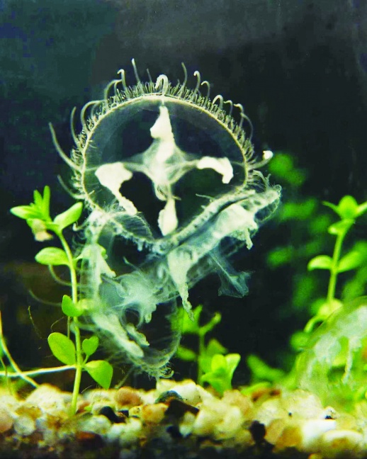 清澈透明的池水中,一群硬币大小、通体透明、宛如小伞般的生物在一张一缩地游动着……天色渐晚,要不是聚精会神地盯着水池,很容易错过这难得一见的场景。
