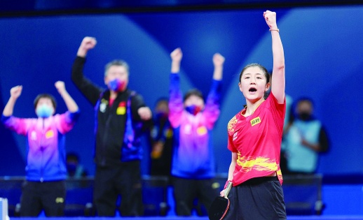 10月8日晚,2022年第56届世界乒乓球团体锦标赛女团决赛上演,中国队三名队员陈梦、王曼昱、孙颖莎发挥出色,3:0完胜日本队,帮助中国队以八战全胜的骄人战绩夺冠,如愿捧起考比伦杯,并实现世乒赛五连冠。图为中国队选手陈梦在比赛中庆祝,她以3比0战胜日本队选手木原美悠。新华社 图