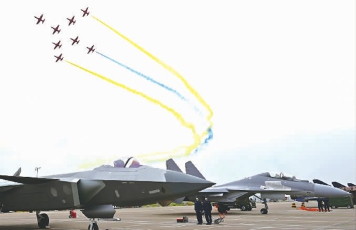 第十四届中国航展11月8日在广东珠海开幕,空军50型武器装备在航展上集中亮相,集中展示新时代十年的历史性成就,展示现代化战略空军建设的阶段性成果。图为空军航空大学“红鹰”飞行表演队劲舞长空和运油-20在进行飞行展示。