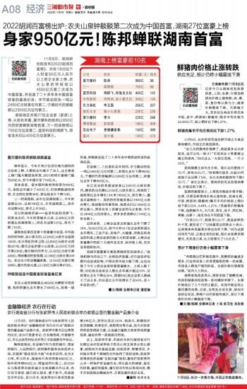 11月8日,胡润研究院发布《2022胡润百富榜》,共有1305位个人财富50亿元人民币以上的企业家上榜。农夫山泉的钟睒睒以4550亿元第二次成为中国首富,并创造了二十多年来中国首富财富的最高纪录;字节跳动的张一鸣以2450亿元财富位列第二,宁德时代的曾毓群以2300亿元位列第三。