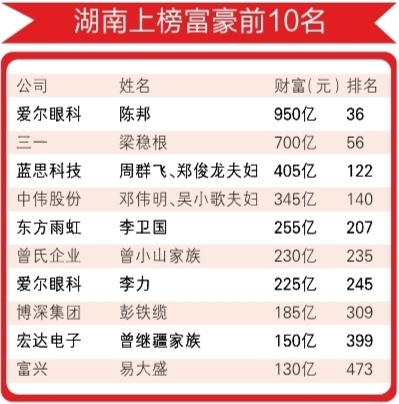 湖南地区共有27位企业家(家族)上榜,从排名来看,爱尔眼科的陈邦以950亿元的财富蝉联湖南首富,三一的梁稳根以700亿元位居第二,蓝思科技的周群飞、郑俊龙夫妇以405亿元位居第三。