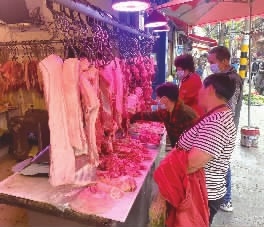 “这几天的猪肉价格降了,我赶紧多买点冻起来,也可以吃一阵子!”市民刘女士笑着接过摊主的猪肉,“88元这么一大袋五花肉,一斤才22元。”