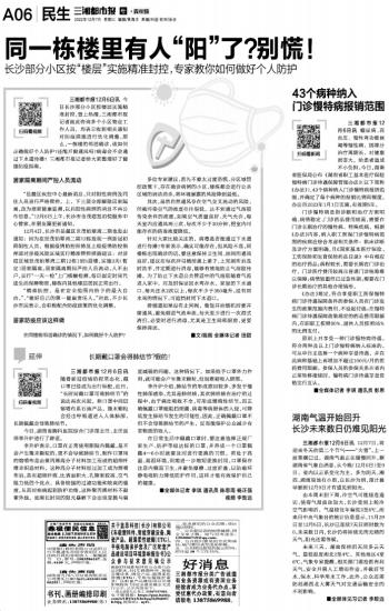 “岳麓区疾控中心最新消息,只对阳性病例及同住人员进行严格管控,上、下三层全部解除居家隔离,改为居家健康监测,以后阳性病例的消息不再公布信息。”12月6日上午,长沙市金茂建发泊悦服务中心管家,在朋友圈更新通知。