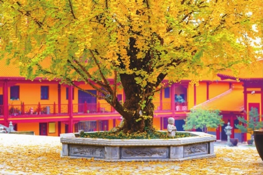 12月19日,长沙望城区的洗心禅寺内,古老的银杏染上了金黄。满地落叶与明黄的墙面、冬日的暖阳携手涂上金灿灿的颜色,诉说着曾经的故事。目前古刹银杏已进入最佳观赏期,前来打卡取景的市民游客,记得戴好口罩,文明观赏。