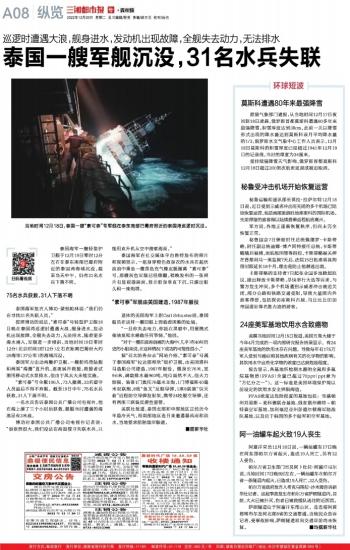 泰国一艘军舰沉没,31名水兵失联