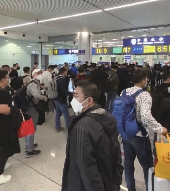1月8日15时26分,南航湖南分公司CZ8360河内—长沙航班顺利降落在黄花国际机场。这是新冠病毒感染“乙类乙管”总体方案实施后,首个在湖南落地的国际航班。左图为航班落地后,旅客相继从到达大厅走出。