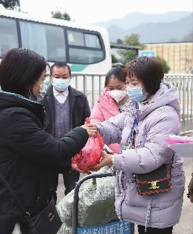 1月26日,城步苗族自治县城北车站,工作人员给乘车的务工人员发放“爱心礼包”。春节期间,该县人力资源和社会保障局从1月26日(正月初五)到1月29日(正月初八),开通多趟至广东、上海等地的专班,帮助务工人员免费出行,助力稳就业、保就业。