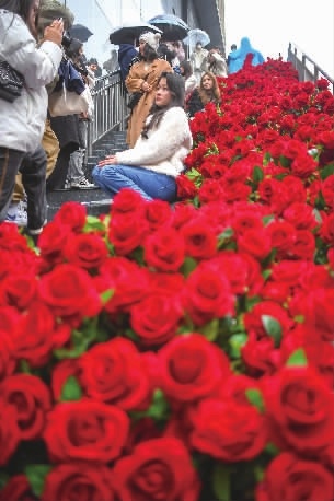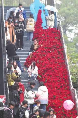 2月11日,长沙市天心区坡子街,游客在铺满鲜花的楼梯上拍照留念。“网红长沙”街头爱意浓浓,到处都有满满的玫瑰吸引游客拍照,留下美好瞬间。