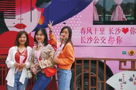 在长沙市橘子洲游客中心附近,一辆“女神节”主题公交车已换上“新衣”,吸引了不少游客驻足拍照打卡。通过车身巨幅广告海报,装饰整体粉色的车身。车内鲜花彩灯和“3.8女神节”海报让市民乘客沉浸式感受过节氛围。“这辆公交车太可爱了,从里到外都是粉色的,我还是第一次见。”从西安来长沙橘子洲打卡的游客王女士向记者笑说道,“长沙是懂仪式感的。”
