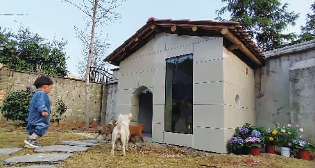 深红色琉璃瓦屋顶、米白色瓷砖墙面、通透的全景落地窗、雅致的爱心泳池、青石板小路、柔软草坪、电视、空调、智能音箱、扫地机器人……你敢想吗?这栋花园“别墅”的住户竟然是一群农村小狗。