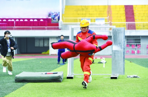 3月22日,在湖南安全技术职业学院,湖南省第四届应急救援技能竞赛开幕,湖南省应急管理厅现场为23支省级专业应急救援队伍授牌。尽管天空飘着细雨,但是参赛选手依旧风雨无阻,热情高涨,一支支赛场“劲旅”和一个个竞技“骄子”涌现出来。 图为选手抱起人体模型进行紧急转移。