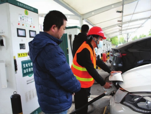 国网湖南电动汽车服务有限公司坚持“人民 至上、生命至上”的安全发展理念,坚持“安全第一,预防为主,综合治理” 的安全生产方针,落实落地“用心尽责,共享平安”的安全生产文化,强化“管业务必须管安全”要求,大力营造安全齐抓共管、严抓严管的良好氛围,严格人员履职尽责,严控风险隐患,严守人身安全底线。图为3月20日,长沙圭塘河二号停车场充电站正处于充电高峰期,运维人员对场站进行安全检查的同时为充电车主进行充电服务和现场安全告知。