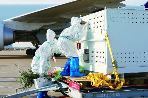 4月27日16时26分,23岁的旅美归国大熊猫“丫丫”抵达上海浦东国际机场,随后被送往隔离检疫圈舍。在隔离检疫期间,北京动物园专家团队将全天24小时陪护。■均据新华社