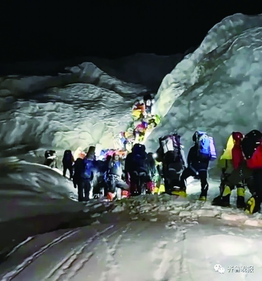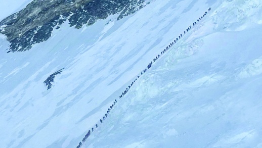 2019年5月,拥堵再度上演。据媒体报道,为了登顶,两三百人沿着危险的悬崖排起了单列长队,在海拔8000米以上的极端环境下等候了数个小时。数个小时排队造成的延误,会消耗超出预期的氧气和体力,也会增加冻伤的风险。