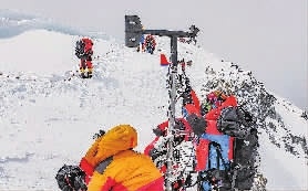 5月23日凌晨3时,科考队员从海拔8300米的突击营地出发,历经数小时攀登,终于抵达海拔8830米的世界最高自动气象观测站。固定钢筋绳索,更换蓄电池,安装风速风向传感器……经过约1小时的紧张工作,气象站零部件升级工作全部完成。随后,他们攀登至8848.86米的峰顶,利用工具成功采集雪冰样品。