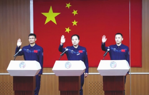 5月29日,神舟十六号航天员乘组与中外媒体记者集体见面会在酒泉卫星发射中心问天阁举行。这是指令长景海鹏(中)、航天飞行工程师朱杨柱(右)、载荷专家桂海潮挥手致意。神舟十六号载人飞船将于北京时间5月30日9时31分发射。
