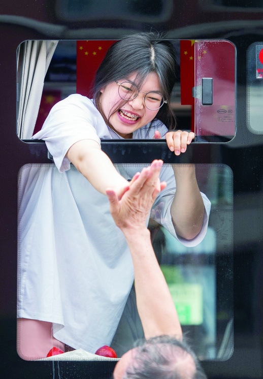 6月7日,在湖南省永州市道县道州玉潭(东阳)学校,老师与考生击掌鼓劲。新华社 图 |