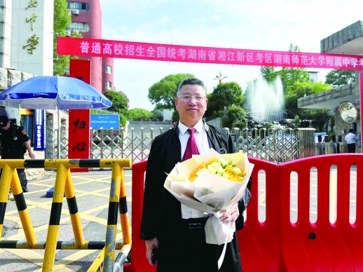 三湘都市报6月7日讯 今日上午8时40分,在湖南师范大学附属中学考点外,身着律师袍、抱着向日葵花束的李先生正向前往考场的儿子挥手鼓劲。