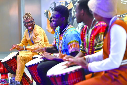 上图:来自非洲的表演者在进行非洲鼓表演。新华社 图