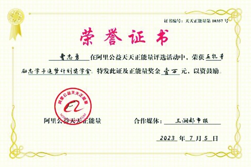 7月6日,湖南第一份正能量励志学子追梦奖学金发给了曹志勇,奖金10000元。