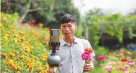 7月9日,烈日当头,聂廷胜打造的小院内,蜀葵、黄秋英、百日菊、万寿菊……正值最美的绽放期,姹紫嫣红的色彩,让人有种走进油画中的错觉,郁郁葱葱的花草树木隔开了炙热的阳光,小院里一片难得的清凉。今年48岁的聂廷胜在小院里一边给花浇水除草、剪枝,一边用三角架固定手机记录着这一切,这也是他多年来的日常。