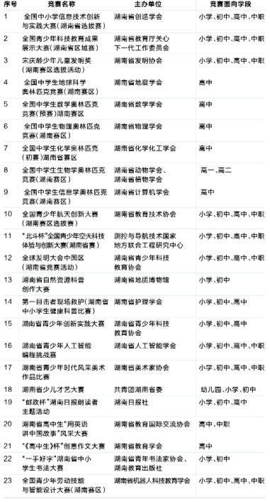 三湘都市报7月19日讯 坚持公益性原则,不得以营利为目的,做到“零收费”……近日,2023-2025学年我省面向中小学生开展的全省性竞赛活动公布,其中包含全国中小学信息技术创新与实践大赛(湖南省选拔赛)等23项竞赛,这些竞赛活动有效期限原则上为3年,在此期间每年举办不得超过1次,值得注意的是,竞赛以及竞赛产生的结果不得作为中小学招生入学的依据,一起看看有哪些竞赛吧!