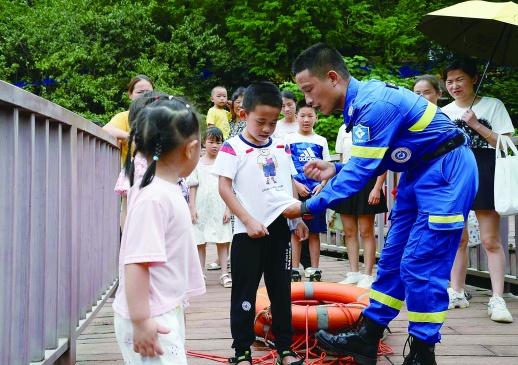 若遇到他人、同伴落水,该如何选择正确的施救呢?“一不能手拉手施救、二不能入水施救。应该大声呼喊,寻求成年人的帮助,条件允许的情况下可寻找漂浮物抛给落水者或用竹竿、绳子进行营救,及时报警。”在室外教学环节,长沙县蓝天救援队队长陈槐通过现场演示,告诫同学们一定要远离危险水域,保护自身安全。